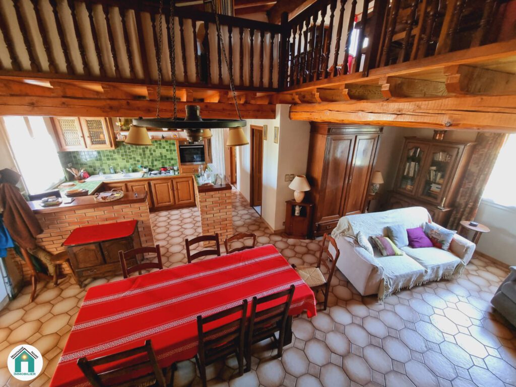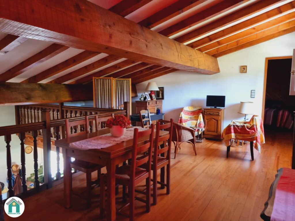 Du salon salle à manger, nous avons accès à une grande mezzanine et une grande chambre sous toit avec douche et WC séparé, ainsi qu’un espace de rangement.