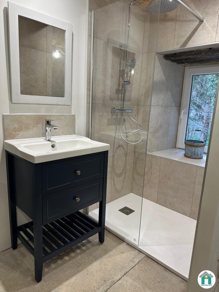 Au premier étage de la partie habitable , nous trouvons deux jolies chambres dont une très grande, les deux avec des rangements, une belle salle de bain avec baignoire, douche et WC.