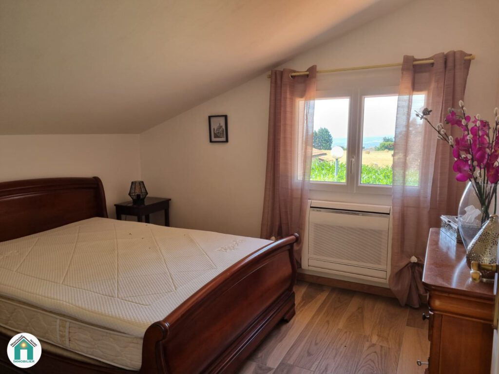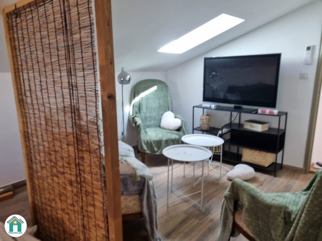 De l’espace salon, nous accédons à une partie qui peut être indépendante ; composée d’une véranda où se situe un espace pour manger et une cuisine qui est à terminer d’aménager, puis à l’étage nous trouvons un très bel espace sous toit avec un petit coin télé, une chambre ouverte et une autre chambre séparée, une salle d’eau avec WC le tout pour une surface au sol de 41 m².